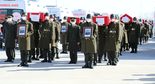 Elazığ'da şehitler için tören Ambulanslarla törenin düzenlendiği Elazığ Havalimanı'na getirilen şehitlerin Türk bayrağına sarılı naaşları, silah arkadaşlarının omuzlarında katafalka konuldu.