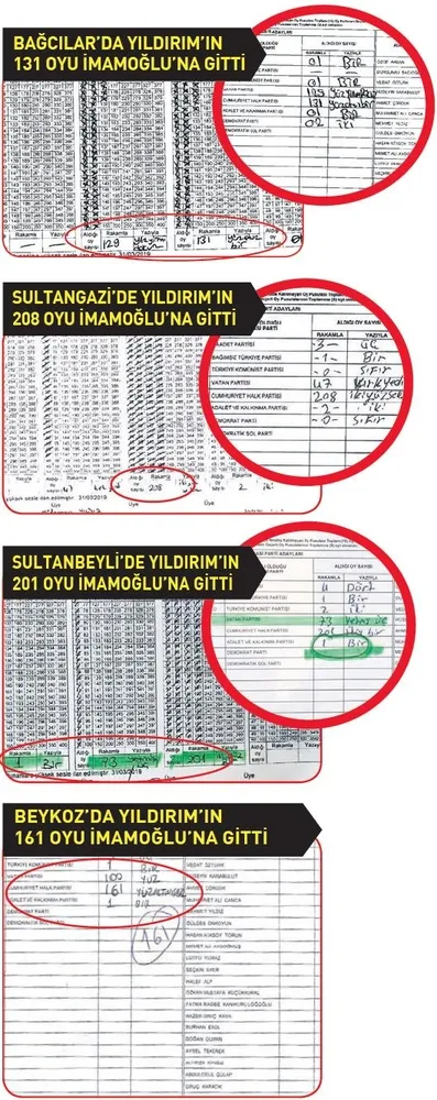 SULTANBEYLİ: Adil Mahallesi'nde 2004 No'lu sandıkta Yıldırım'ın aldığı 201 oy tutanağa 1 olarak yazıldı. Yıldırım'ın 201 oyu İmamoğlu'na yazılırken, İmamoğlu'nun 73 oyu Vatan Partisi adayına yazıldı. Yıldırım'a ise Demokrat Parti adayının 1 oyu yazılarak sonuçlar manipüle edildi. Seçim sandık tutanağında, İmamoğlu'na 328 oyun fazladan yazıldığı belgelendi. İlçedeki 1070, 1229 ve 2194 No'lu sandıklarda da hatalar tespit edildi. 2194'te Yıldırım'a yazılması gereken 216 oy Vatan Partisi'ne gitti. 1229'da İmamoğlu'na yazılması gereken 67 oy Yıldırım'a, Yıldırım'ın 188 oyu Demokrat Parti adayına yazıldı. 1070'te ise İmamoğlu'na 187 oy çıktı, Yıldırım'a hiç oy yazılmadı.
