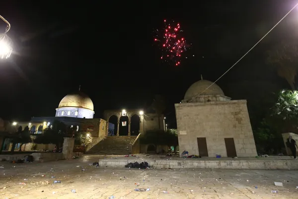 Çok sayıda Filistinli Kadir Gecesi münasebetiyle geldikleri Mescid-i Aksa'da teravih namazını kıldıktan sonra Şam Kapısı'nda toplandı.